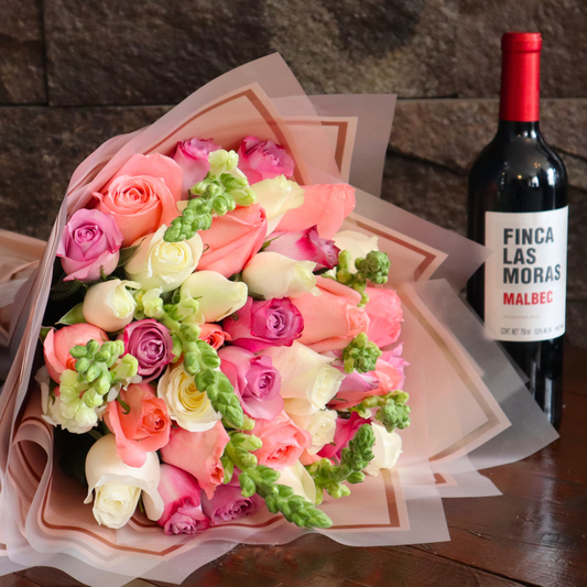 LE FESTIN - Divino arreglo de rosas rojas, chocolates y vino